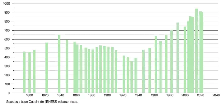 L'évolution du nombre d'habitants est connue à travers les recensements de la population effectués dans la commune depuis 1793. Pour les communes de moins de 10 000 habitants, une enquête de recensement portant sur toute la population est réalisée tous les cinq ans, les populations légales des années intermédiaires étant quant à elles estimées par interpolation ou extrapolation[12]. Pour la commune, le premier recensement exhaustif entrant dans le cadre du nouveau dispositif a été réalisé en 2004[13].