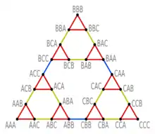 Le diagramme montre l'arbre du jeu avec trois disques. La position initiale est située à l'un des sommets du triangle, par exemple AAA, la position finale étant un autre sommet, BBB ou CCC. La couleur des arêtes indique le disque à déplacer : rouge pour le plus petit disque, jaune pour le disque intermédiaire, et bleu pour le grand disque.