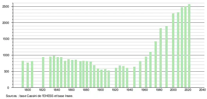 L'évolution du nombre d'habitants est connue à travers les recensements de la population effectués dans la commune depuis 1793. Pour les communes de moins de 10 000 habitants, une enquête de recensement portant sur toute la population est réalisée tous les cinq ans, les populations légales des années intermédiaires étant quant à elles estimées par interpolation ou extrapolation[27]. Pour la commune, le premier recensement exhaustif entrant dans le cadre du nouveau dispositif a été réalisé en 2006[28].