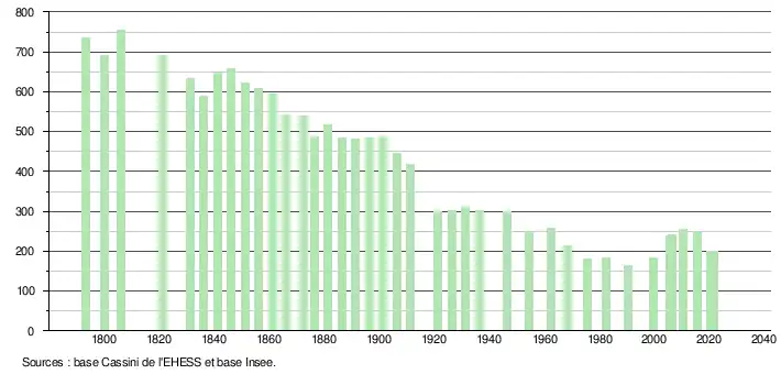 L'évolution du nombre d'habitants est connue à travers les recensements de la population effectués dans la commune depuis 1793. Pour les communes de moins de 10 000 habitants, une enquête de recensement portant sur toute la population est réalisée tous les cinq ans, les populations légales des années intermédiaires étant quant à elles estimées par interpolation ou extrapolation[20]. Pour la commune, le premier recensement exhaustif entrant dans le cadre du nouveau dispositif a été réalisé en 2005[21].
