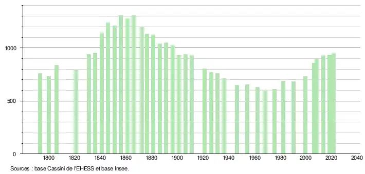 L'évolution du nombre d'habitants est connue à travers les recensements de la population effectués dans la commune depuis 1793. Pour les communes de moins de 10 000 habitants, une enquête de recensement portant sur toute la population est réalisée tous les cinq ans, les populations légales des années intermédiaires étant quant à elles estimées par interpolation ou extrapolation[17]. Pour la commune, le premier recensement exhaustif entrant dans le cadre du nouveau dispositif a été réalisé en 2008[18].