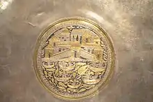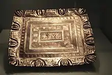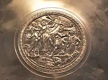 Sous les plaques se trouve une plaque forgée et ciselée avec des rainures circulaires tournées au tour. La plaque est convexe vers l'intérieur. Il a un bord horizontal et un anneau de base. Une gorge et plusieurs rainures décorent le bord. Il a été fortement endommagé par l'excavateur et a été recollé lors de la restauration. Un vieux patch a également été remarqué[Quoi ?]. En soi, la plaque n'est pas spectaculaire. Toutefois, le nom "P ROMVLO" est gravé sur la face inférieure du socle[8]. Seuls deux Romulus de haut rang sont connus aux alentours de 350 : le consul de l'année 343 Flavius Romulus et un Romulus qui était commandant de l'armée de Magnence et qui est mort à la bataille de Mursa le . Le consul se retire en tant que propriétaire en raison de son nom de famille[Quoi ?]. Le commandant a peut-être enterré ses objets de valeur avant de partir au combat et ne les a jamais récupérés. Il serait un propriétaire possible.