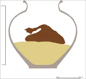 Le sac dénommé « Fait 100-101 » reposait sur un sédiment argileux[A 11]. Dans le sac « Fait 104 », une petite corde blanche est découverte, qui devait servir à nouer ce sac[A 12]. La majorité des couches ou « faits » sont séparés entre eux par de fines couches d'argile qui ont permis aux archéologues de séparer les différentes pièces « en vrac » par période[A 13].