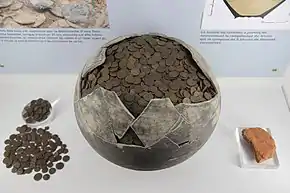 Les monnaies sont des nummi, pièces de bronze avec très peu d'argent, d'un poids de 3 grammes et de 18 mm de diamètre[B 1], introduites dans la décennie 330[G 4]. Les pièces sont accumulées sur une période de dix ans et déposées dans le vase dans de petites bourses[C 1] de tissu qui ont disparu[D 1]. Avec le temps, les éléments (écorce, cuir, papyrus, peau, tissu) qui constituent le sac se sont désagrégés et les pièces ont été libérées, mais en restant dans leur position d'origine[A 9]. Des épis de céréales semblent avoir volontairement été déposés dans le contenant pour en absorber l'humidité[A 10].