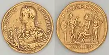 Multiple d'or de huit aurei frappé par l'atelier de Rome en 230 par l'empereur Sévère Alexandre (règne de 222 à 235). Poids : 51,14 g. exemplaire unique, parmi les plus lourds multiples connus. À l'avers, buste à gauche de l'empereur lauré et cuirassé tenant dans le main droite une statue de Niké. Légende : IMP SEV ALE/XANDER AUG. Au revers : L'empereur assis au centre sur une chaise curule, tenant une lance et une statuette de Niké dans la main droite, à gauche un personnage féminin casqué (Rome) tenant sur une colonne un bouclier marqué Vot X, à gauche une femme ailée (la Victoire) portant une palme. Légende en haut PM TRP VIIII[7], à l'exergue COS III PP[8]. Ces pièces de prestige, fabriquées en très faible nombre, étaient données comme récompenses par l'empereur à des personnages de haut rang.