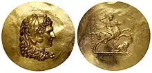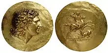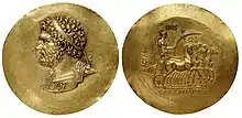 Grande médaille en or, diamètre 67 mm et poids 98,85 g. Frappée à Tarse ou dans un atelier de Grèce du Nord. « Nikètérion » (médaille de victoire) produite sous le règne de Sévère Alexandre ou de Gordien III vers 230/245 après J.C. À l'avers, portrait anépigraphe à gauche de Philippe II de Macédoine, la tête ceinte d'un bandeau et portant une cuirasse richement décorée. Au revers : Un quadrige conduit par une Victoire ailée tenant les rênes d'une main et de l'autre une palme autour de laquelle est noué un ruban de victoire. Inscriptions en grec : au génitif BACIΛE-ΩC AΛEΞANΔPOY (basileôs Alexandrou) (« [médaillon] du roi Alexandre »). Le travail reprend avec virtuosité le style des monnaies grecques des siècles précédents.