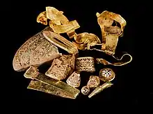 Le trésor comprend plus de 1 500 objets[7]. On y trouve des décorations d'or et d'argent finement ouvragées, détachées des armes auxquelles elles appartenaient à l'origine, parmi lesquelles 66 anneaux de garde d'épée et de nombreuses plaques en or provenant de gardes, certaines avec des incrustations décrites comme des grenats zoomorphiques cloisonnés[13].