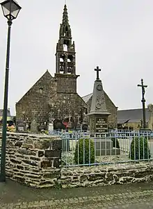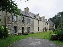 - Le « Maner coz » de Kerézellec : la chapelle, qui avait subi les outrages du temps et dont la charpente avait été en bonne partie emportée par l'ouragan de 1987, a été restaurée depuis[15]. Le manoir est construit en moellons associant du microgranite jaunâtre de Logonna avec un microgranite de provenance locale, l'encadrement de la porte étant en kersanton. « L'utilisation de ces trois roches confère à la façade du manoir un aspect des plus singuliers »[30].