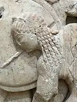 Le côté oriental représente une assemblée des douze Olympiens assis. Au centre (perdu) de l'assemblée, Hermès, tenant la balance remplie des âmes d'Achille et de Memnon, était représenté pesant les âmes (psychostasie). À gauche sont assis les dieux protecteurs de Memnon et des Troyens : Apollon, Arès, Aphrodite et Artémis. Au milieu est assis Zeus sur son trône. Sur l'autre moitié de cette frise, on distingue Achille et Memnon se disputant le corps d'Antiloque mort. La face ouest peut montrer l'histoire du jugement de Pâris, la mort d'Orion ou plutôt Athéna traduisant Héraklès sur l'Olympe[10]. Le côté nord affiche la Gigantomachie. La frise sud est la plus usée ; on discerne nettement les traces de chevaux magnifiquement sculptés : il a été suggéré que la scène représente l'enlèvement d'Hippodamie par Pélops ou des Leucippides par les Dioscures ou l'enlèvement de Perséphone par Hadès. Les reliefs ont été peints avec des nuances vives de vert, de bleu, de rouge et d'or, créant ainsi un code unique de polychromie.