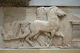 Des parties importantes de la frise sud étant manquantes, nous ne pouvons qu'imaginer le thème qu'elle représentait. C'est probablement le thème populaire de l'Enlèvement des femmes. Cependant, les fragments survivants sont des chevaux en relief, bien sculptés et pleins d'énergie, qui prouvent la maîtrise de l'artiste.