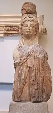 La façade du trésor ionique des Siphniens présente deux korai (jeunes filles) entre les pilastres, au lieu de colonnes, pour soutenir l'architrave. Ce type de décoration opulente aux figures féminines pleines de mouvement et de plasticité préfigure les Cariatides érigées ultérieurement à l'Érechthéion sur l'Acropole d'Athènes.