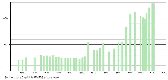 L'évolution du nombre d'habitants est connue à travers les recensements de la population effectués dans la commune depuis 1793. Pour les communes de moins de 10 000 habitants, une enquête de recensement portant sur toute la population est réalisée tous les cinq ans, les populations légales des années intermédiaires étant quant à elles estimées par interpolation ou extrapolation[27]. Pour la commune, le premier recensement exhaustif entrant dans le cadre du nouveau dispositif a été réalisé en 2004[28].