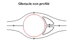 Dans le cas d'un fluide idéal (sans viscosité), le fluide est accéléré à l'amont et ralenti à l'arrière. En application du théorème de Bernoulli[7], la pression à la surface du corps diminue juste après le point d'arrêt (où elle est maximale), atteint un minimum près du maître couple du corps, puis réaugmente peu à peu pour retrouver (théoriquement) la même valeur qu'à l'amont. Ainsi apparaît le paradoxe de D'Alembert : sans viscosité, l'intégration des efforts de pression sur le corps résulterait en une traînée nulle. En réalité, les fluides sont visqueux (avec cet avantage que la viscosité maintient leur cohésion). Lorsque, dans le fluide, les efforts dus à cette viscosité deviennent faibles (relativement aux efforts dus à l'inertie), c'est-à-dire aux nombres de Reynolds relativement élevés (cas des véhicules courants), il se produit souvent un décollement de l'écoulement ou plus exactement un décollement de la couche limite. Ce décollement résulte en un tourbillon aval (ou de culot) en nette dépression qui crée une forte traînée (dite de culot).
