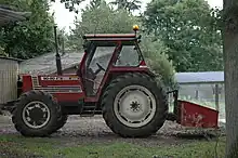 Le tracteur agricole dans sa forme la plus classique possède quatre roues, les roues arrière sont motrices et de plus grand diamètre que les roues avant directrices. Les tracteurs à deux roues motrices sont de plus en plus rares. En effet, les agriculteurs utilisent des tracteurs de plus en plus puissants, demandant plus d'adhérence[15] et donc à quatre roues motrices. Le poste de conduite du tracteur peut être ouvert ou constitué d'une cabine dans laquelle le conducteur prend place sur un siège unique situé au centre. Les tracteurs modernes sont plus confortables (cabine suspendue, climatisée, siège pneumatique).