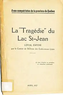 - La Tragédie du Lac St-Jean, loyal exposé par le Comité de Défense des Cultivateurs Lésés, avril 1927