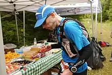 Une ceinture porte-gourde (ou sac à dos avec une poche à eau) contenant de l'eau et/ou des produits énergétiques notamment pour les trails supérieurs à 21 km. Des produits solides sont également recommandés.