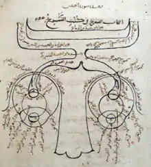 Alhazen décrit la vision comme faisant intervenir deux instances différentes. L'œil n'a qu'un rôle de récepteur de la lumière et de la couleur, et est traité comme un instrument optique[5] dont il fait une anatomie complète descriptive et fonctionnelle[11]. Il attribue au cristallin la capacité de renseigner sur l'intensité lumineuse[12] et le voit comme une lentille réfringente bi-convexe[13]. Il accepte l'opinion, généralement admise à son époque, que l'humeur cristalline est le siège principal de la sensation visuelle[14]. L'unité de la vision binoculaire est assurée par un mouvement de convergence conjoint des deux yeux sur le point de fixation et la diplopie se produit lorsque cette fonction n'est pas assurée[15]. Ibn al-Haytham fait une étude détaillée des conditions de fusion des images binoculaires au moyen d'une tablette expérimentale, qui sera reprise jusqu'à l'époque classique [16]. L'œil perçoit donc la taille, la forme, la transparence (couleur et luminosité), la position et le mouvement mais la distinction cognitive se fait au niveau du cerveau. Pour Alhazen, la perception n'est pas seulement physique mais psychologique et tout acte de vision est accompagné d'une activité mentale de reconnaissance, comparaison, discernement, jugement et inférence[17].