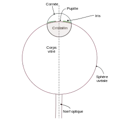Il examine aussi la structure anatomique de l'œil. Selon Alhazen, l'œil est constitué de deux sphères. La plus grande est la sphère uvéale contenant le corps vitré, la plus petite est la sphère de la cornée. Les deux sphères s'intersectent selon une lentille bifocale qui donne le cristallin. Il place le nerf optique dans l'alignement des centres des deux sphères, au lieu de le déporter vers le nez[27]. Tous ces éléments sont inclus dans des membranes (non représentées dans le schéma ci-contre) destinées à maintenir la cohésion de l'ensemble. On retrouve dans cette conception anatomique quelques éléments figurant déjà chez Galien[28]. Quand il cherche à expliquer comment les rayons lumineux, en pénétrant dans l’œil, peuvent reconstituer l'image d'un objet, il se heurte à deux problèmes. Le premier est le diamètre de la pupille qui, trop important pour être considéré comme un trou d'aiguille, doit théoriquement reproduire une image floue. Ne voyant pas le cristallin comme une lentille capable d'effectuer une mise au point, il émet l'hypothèse que seuls les rayons traversant les surfaces de contact perpendiculairement sont conservés[29]. Ce qui le conduit à utiliser une réfraction pour qu'un même rayon soit perpendiculaire à la cornée et au cristallin. Le second problème rencontré est que ce fonctionnement conduit à avoir une image inversée dans l’œil. Cette inversion parait inconcevable à Alhazen qui redresse l'image par une nouvelle réfraction (solution élégante mais fausse)[30].