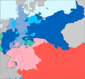 La Confédération germanique est dissoute. Une Confédération de l'Allemagne du Nord, regroupant sous présidence prussienne les pays situés au nord du Main, est créée. Les États du sud de l'Allemagne, Grand-duché de Hesse-Darmstadt, Grand-duché de Bade, Royaume de Wurtemberg et Royaume de Bavière accèdent à une complète indépendance. L'Autriche est exclue de l'espace germanique.