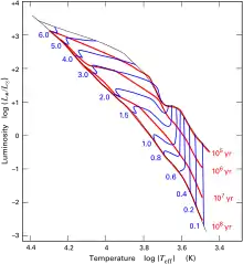 La fin, i.e. le point de plus à gauche de chaque trajet, est identifié avec la masse de l'étoile en masses solaires et représente sa position sur la séquence principale. Les courbes rouges, identifiées en années, sont isochrones aux âges donnés. En d'autres termes, les étoiles de 105 ans sont sur la courbe identifiée par 105 et de même pour les trois autres isochrones.