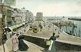 L'embranchement vers Mers fut seulement ouvert à la circulation le 10 juillet 1904[12]. Une première mise en service avait été effectuée dès le 26 juin, mais, le lendemain, l'exploitation s'arrêta à cause de l'arrachement des supports des fils du pont tournant par un trois-mâts qui franchissait la passe étroite reliant l'avant-port et le bassin à flot du Tréport[12]. Ce prolongement ajoutait plus de 750 mètres de voie au réseau mais le court tronçon n'était ouvert que pour le service d'été. De nouvelles négociations s'engagèrent avec les édiles mersois et un prolongement jusqu'à La Prairie, au centre de la ville picarde, fut ouvert au public le 2 juillet 1909[12] ; 400 nouveaux mètres s'ajoutaient ainsi au tramway qui atteignit sa longueur maximale de 6 290 mètres[13]. La desserte s'effectuait avec une fréquence d'une demi-heure, puis toutes les 20 minutes durant la période estivale ; des départs spéciaux étaient même organisés pour la sortie du casino du Tréport[14].