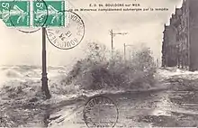 On voit sur cette carte postale la voie du tramway submergée, lors d'une tempête