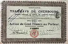 La Compagnie des tramways de Cherbourg est une « société anonyme formée le , par acte reçu chez maitre Lavirotte, notaire à Lyon, définitivement constituée par les Assemblées générales des 113 et . »[5]. L'objet de la société est notamment la « la construction et l'exploitation d'un réseau de tramways dans la ville de Cherbourg et dans les communes suburbaines, pour le transport des voyageurs et des marchandises »[5]. Elle peut utiliser la traction vapeur ou tout autre procédé mécanique et étendre son réseau avec des extensions, des prolongements ou des créations de nouvelles lignes. Enfin elle peut faire elle-même les travaux de construction ou les sous-traiter et exploiter les réseaux concédés[5].