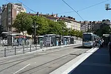 Une rame Citadis 402 et une rame TFS se croisant près de la gare de Grenoble. | ||