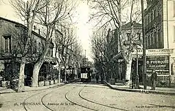 « a) Ligne de Perpignan à la plage de Canet. — Cette ligne partira du poste d'octroi Notre-Dame, traversera la Basse, suivra le glacis et les fossés des fortifications pour emprunter ensuite jusqu'à la mer la voie publique désignée sous le nom de chemin de grande communication n°11, de Salses à Laroque (embranchement de Perpignan à la mer).