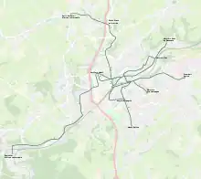 : électrification ; déviation entre la place Verte et la place Sommeleville par les rues Sècheval, Thier Mère Dieu et Crapaurue (nouvelle section) l'ancien tracé est repris par la ligne Verviers - Heusy.