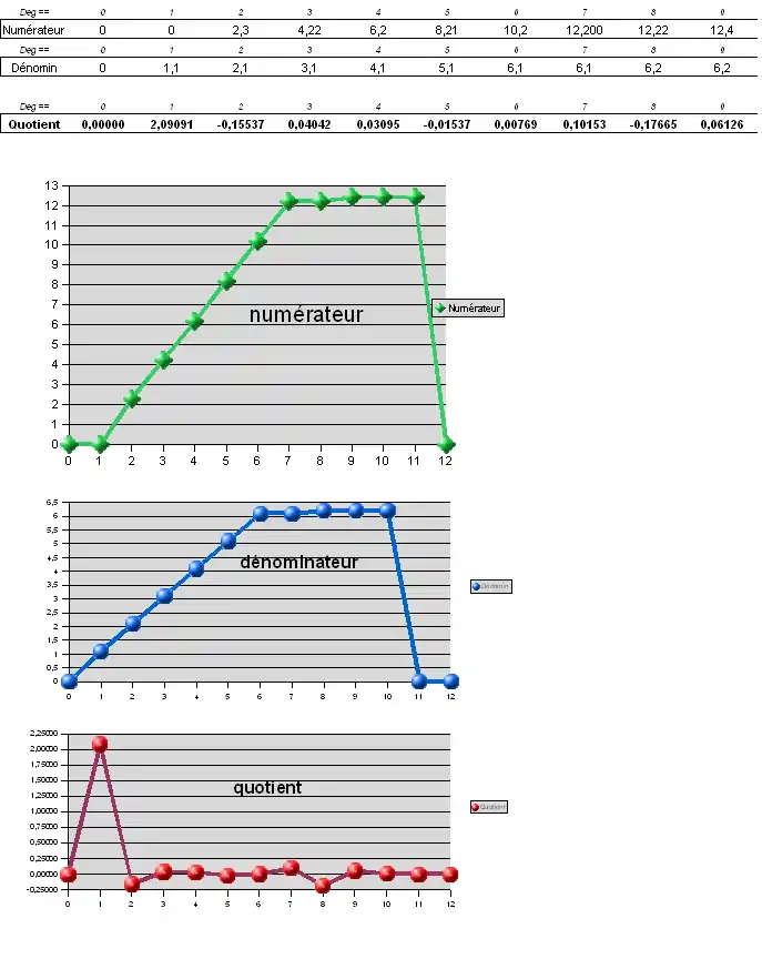 On peut vérifier sur un tableur ou à la main que ces polynômes répondent bien à la définition de la division euclidienne: H(z) = NUM(z)/DENOM(z)= Q(z)+ R(z)/DENOM(z). On suppose que le reste est négligeable par rapport aux coefficients du quotient. Les schémas de ces divers polynômes peuvent être visualisés sur un tableur comme suit.