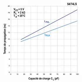 Évolution des temps de propagation des portes 54/74LS (Low-power Schottky) en fonction de la capacité de charge CL, d'après Texas Instruments[3].