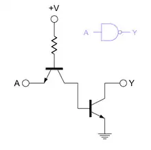 Dans sa version primitive[1],[2], la structure d'une porte TTL élémentaire (en l'occurrence une porte inverseuse – opérateur NON) est constituée de deux transistors bipolaires de même type (communément de type NPN) et d'une résistance, soit :