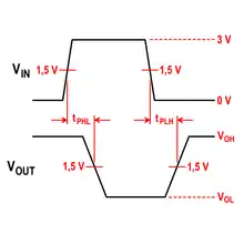 Les délais d'établissement des niveaux logiques transmis entre une sortie TTL et les entrées qui y sont connectées dépendent de la mise en œuvre des circuits intégrés (géométrie des conducteurs électriques, nature des isolants) et des caractéristiques électriques de cette sortie (sortance) et de ces entrées (entrance).