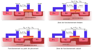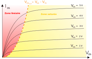 Lorsque le transistor conduit, une augmentation de la polarisation entre le drain et la source augmente le courant (non linéairement). À partir d'une tension de drain supérieure à la tension de grille moins la tension de seuil, le champ électrostatique entre le substrat et la grille s'inverse localement au voisinage du drain. Les électrons disparaissent à cet endroit, le courant sature. Toute augmentation de la tension de drain au-delà de la tension de saturation conduit à une disparition encore plus importante des électrons, et à une faible augmentation (voire nulle) du courant.
