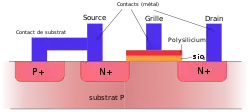 Le transistor est généralement constitué d'un substrat de type P, faiblement dopé, dans lequel on diffuse par épitaxie deux zones N+ qui deviendront la source et le drain. Le silicium au-dessus du canal est oxydé (dioxyde de silicium - SiO2) puis métallisé pour réaliser la grille, ce qui constitue une capacité entre la grille et le substrat.