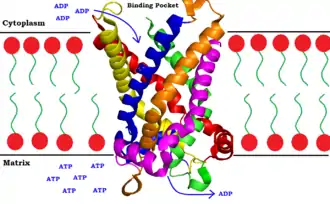 On a longtemps pensé qu'elle fonctionnait de manière asymétrique comme un dimère de sous-unités identiques procédant à l'échange de l'ADP contre l'ATP à travers la membrane mitochondriale interne. L'étude de la structure tridimensionnelle de cette protéine a cependant révélé qu'il s'agit d'un monomère[4], et ce aussi bien dans les détergents[5] que dans les membranes elles-mêmes[6],[7].