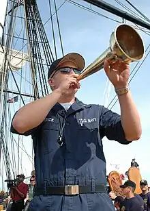 Un exemple peut être donné avec les instructions de l'amiral espagnol Alonso de Chaves (es) (aux environs de 1530)[17] : « The captain-general should encourage all in the battle, and because he cannot be heard with his voice he should bid the signal for action to be made with his trumpet or flag or with his topsail »[note 8].
