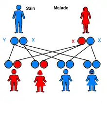 - toutes les filles seront malades, car leur père leur transmet obligatoirement le X, porteur de la maladie.
