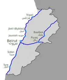 Le réseau routier libanais est en grande partie asphalté mais se trouve dans un mauvais état à cause des guerres successives et du manque d'entretien même si celui-ci s'est tout de même amélioré . Il se concentre surtout le long de la Méditerranée et sur le versant occidental de la première chaine de montagne, à savoir le Mont-Liban.