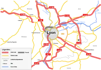 | Autoroute A46 | Autoroute A6 à Anse près de Villefranche-sur-Saône, vers Paris | Tronçon nord : Quincieux, Genay, Cailloux-sur-Fontaines, Rillieux-la-Pape Tronçon sud : Saint-Priest, Mions, Corbas | Autoroutes A7 et A47 à Chasse-sur-Rhône près de Givors, vers Marseille et Saint-Étienne | Autoroute concédée, divisée en deux tronçons reliés par une voie rapide nommée route nationale 346. Le tronçon nord est payant et à 2x3 voies jusqu'à l'A432, puis gratuit et à 2x2 voies au-delà (sauf un court tronçon à 2x3 voies à Rillieux-la-Pape). Le tronçon sud est gratuit et à 2x2 voies. |