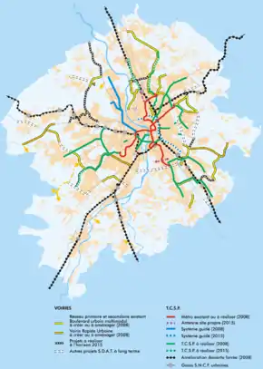 - la construction de nouveaux boulevards urbains, tels la Voie du Canal St Martory (route + site propre) ou la Jonction Est[25] (routière uniquement), le réaménagement du Palays (énorme échangeur routier au sud de Toulouse), et bien d'autres projets routiers ;