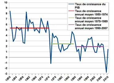 - régulière tout au long de la période 1945-1973 : les faibles récessions constatées ne remettent pas en cause cette régularité, si bien que la période des Trente Glorieuses laisse supposer le caractère atténué des fluctuations cycliques qui ont été une caractéristique du XIXe siècle et de l'avant-guerre.