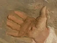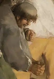 Dans le Tres de mayo, l'homme levant les bras au centre de la composition a souvent été comparé au Christ crucifié[46], une pose similaire pouvant régulièrement être vue dans des représentations du Christ dans l'épisode de l'agonie dans le jardin des oliviers[47]. Le personnage de Goya présente des stigmates sur la main droite[43] et la lanterne située au centre, devant les soldats fait référence aux attributs des soldats romains qui ont arrêté le Christ dans le jardin[N 10]. En plus de poser comme un crucifié, il est habillé de jaune et de blanc : les couleurs héraldiques de la papauté[48]. Dans le Tres de mayo, cependant, il n'y a aucune expression de transcendance ni de sacrifice de la vie qui mènera au salut.
