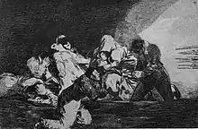 Bien que le peuple espagnol ait déjà accepté des monarques étrangers par le passé, il rejette profondément le dirigeant français. Le , les rumeurs d'éviction des derniers membres de la famille royale espagnole poussent le peuple à se soulever contre lui. Joachim Murat proclame ce jour-là à ses troupes que la révolte contre les Français mérite vengeance et que toute personne arrêtée pendant le soulèvement sera exécutée[10]. Goya commémore la révolte espagnole dans son Dos de mayo (deux mai), qui représente une charge de la cavalerie contre les rebelles sur la place de la Puerta del Sol, à Madrid[11]. Il documente également le jour suivant dans Tres de mayo (trois mai), beaucoup plus connu, qui illustre les représailles françaises : au crépuscule, des centaines d'Espagnols sont rassemblés et exécutés dans plusieurs endroits de Madrid. L'opposition civile locale persiste et s'ensuit la guerre d'indépendance espagnole qui aura lieu les quatre années suivantes[9]. Des forces armées espagnoles irrégulières aident considérablement les armées espagnole, portugaise et britannique, menées par Arthur Wellesley, duc de Wellington — c'est ainsi la première fois qu'on utilisera le terme de guérilla. À l'époque où Goya a peint ces tableaux, les révoltés sont érigés en symboles d'héroïsme et de patriotisme[12].