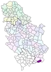 La municipalité de Trgovište est située à l'extrême sud de la Serbie, le long de la frontière avec la République de Macédoine ; elle est bordée par les municipalités de Bosilegrad, Vranje et Bujanovac. Le territoire municipal, qui s'étend sur 370 km2, est une zone constituée de collines entourées de montagnes et de plateaux ; parmi les montagnes, on peut citer les Bele Vode, le Dukat, le Čupino brdo et le Kozjak. L'altitude y est comprise entre 520 m et 1 828 m (pic du Golem vhr)[2], avec des pics comme ceux de la Zladovačka planina (1 574 m) au nord ou de la Kopljača planina (1 345 m) au sud-ouest[3].