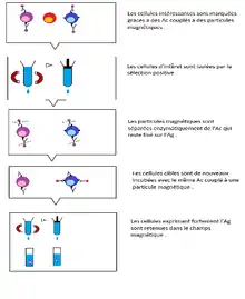 Le résultat est toujours le même: parmi la population de cellules initiale, certaines seront couplées à des particules magnétiques et d'autres non. Ces cellules sont ensuite séparées en utilisant un champ magnétique; plusieurs variantes de la technique existent