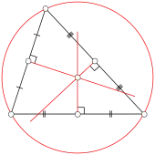 Si le triangle est non plat, les trois médiatrices des côtés (les droites coupant les côtés à angle droit en leur milieu) sont concourantes en un point appelé centre du cercle circonscrit, car il est le seul équidistant des trois sommets, c'est-à-dire qu'il est le centre du seul cercle passant par les trois sommets. Ce centre est souvent noté O ou Ω (« oméga »).