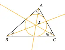 Si le triangle est non plat, les trois bissectrices de ses angles (les demi-droites qui partagent les angles en deux angles de même mesure) sont concourantes en un point appelé centre du cercle inscrit, car il est le centre du seul cercle tangent aux trois côtés. Ce centre est en général noté ou .