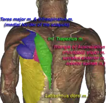 Représentation du triangle ausculatoire en rose entouré des muscles le délimitant.